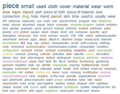 To get a better idea of the main qualities that constitute patchiness for the English speaker, we dumped all the definitions of patch from a handful of dictionaries into the Visual Thesaurus VocabGrabber to produce this frequency-sorted wordcloud: