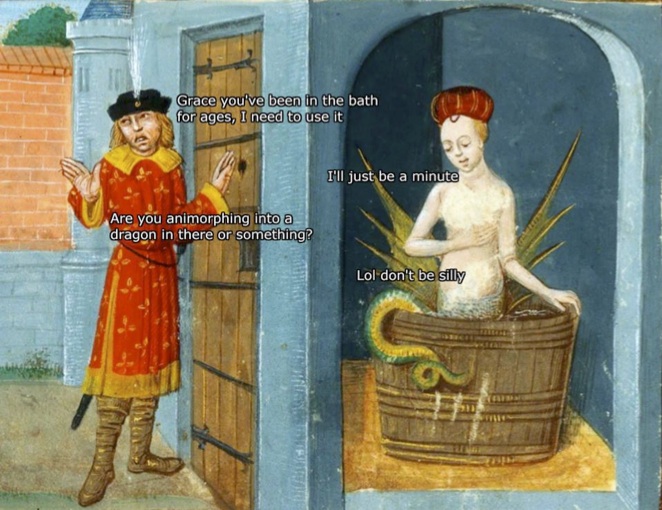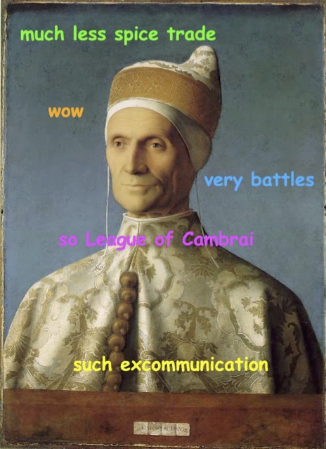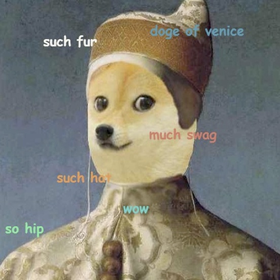 In a Lounge column last year I talked about the use of language in Internet memes. This is an area ripe for exploitation of burlesque because we have at our disposal a number of tools that facilitate the juxtaposition of the high and low with a few simple clicks and Photoshop hacks. In that column I talked about the humor of the doge meme, one that does not rely on burlesque. But it's not difficult to push the envelope of the doge meme into the area of burlesque by mixing up the memetic doge (a shiba inu) with the Doge of Venice; and it wasn't long after the doge meme appeared that the Doge meme variant was born:
