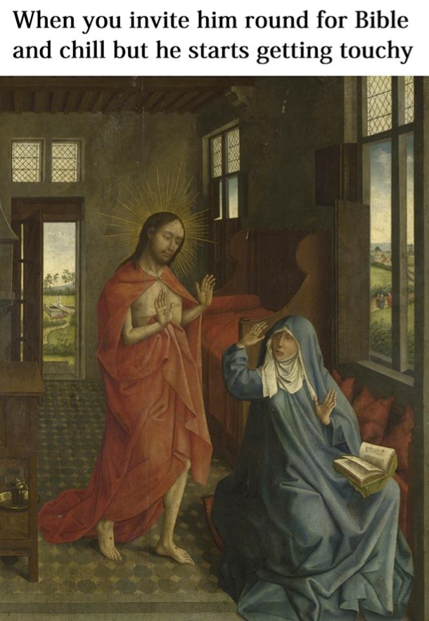 I love this kind of thing, and I'm clearly not alone in getting a chuckle out of it, because entire websites and Facebook pages are devoted to quick-and-easy mashups of high and low that have an immediate comic appeal. One Facebook community, Classical Art Memes, is by its nature a hotbed of burlesque. The idea there is to start with an image from pictorial art, often a well-known one. This is obviously the "high" element, because we know that we are supposed to revere art and take it seriously. Such images from art are then matched up with a surprising caption, often written in slang or an informal register, that brings the elevated image crashing down to earth through some comic misinterpretation. As with much Internet humor, the misses on Classical Art Memes often outnumber the hits, but the hits can be hilarious (to my mind, anyway), like this one that takes its inspiration from a late 15th-century painting, "Christ appearing to the Virgin":