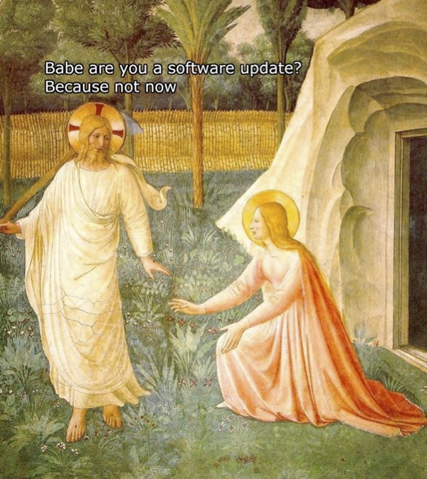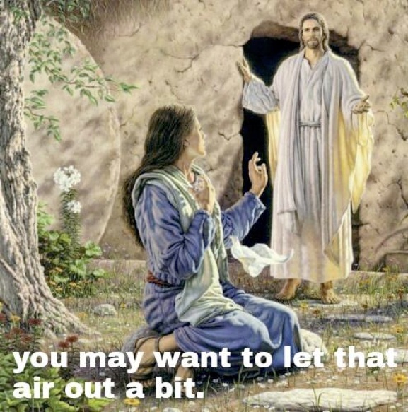 It's no accident that images from religion provide fertile ground for burlesque: what other topic is viewed by so many as sacrosanct, not to be subject to any treatment that detracts from its dignity and grandeur? Of course the very existence of such notions merely invites people to break the rules, and now that everyone has access to meme-building tools, the distance between the irreverent imagination and the published meme is only a few short keystrokes and clicks. Here are a couple of examples of religious burlesque, both inspired by the Biblical account of Jesus' resurrection as depicted in art:
