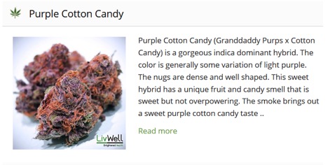 Here's an example from the website of LivWell, a local chain of medical dispensaries. The description suggests that new strains developed for sale may borrow some of their nomenclature from parentage, much the way that people and pedigreed animals do.