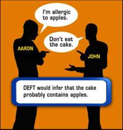 Two programs currently being funded by the US Department of Defense are DEFT (Deep Exploration and Filtering of Text) and BOLT (Broad Operational Language Translation). The online splash page for DEFT has this graphic, which illustrates one of the core problems of intelligent natural language processing in a rather innocent way. Silhouetted Aaron and John exchange dialogue in which Aaron reveals his (somewhat unusual) allergy to apples, and John helpfully warns him against eating the cake. Aaron (and any human listening to the short dialog) would make the inference that the cake contains apples, but it is beyond the ability of computers currently to make such a connection.