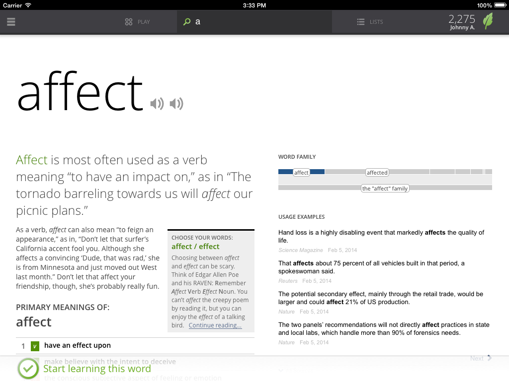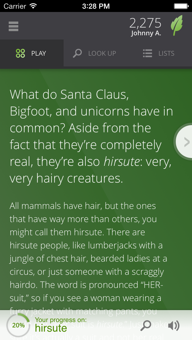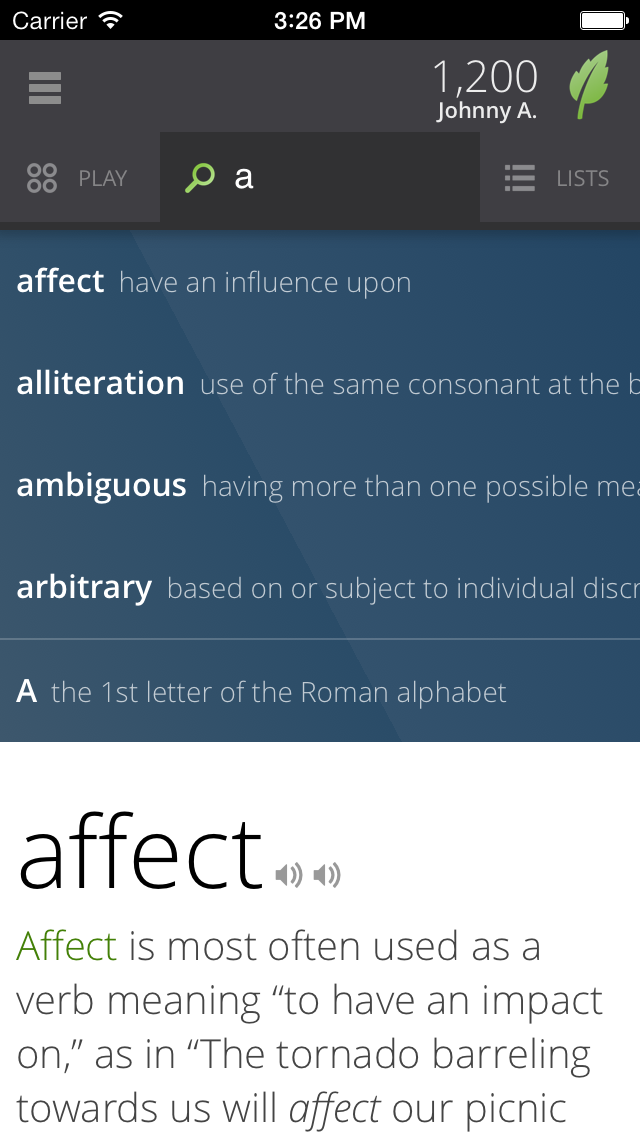 Look it up. Think of a word. Start typing. Within a few key taps, you'll see a friendly explanation of the word that will help you remember its meaning. It’s as if your favorite teacher were explaining it to you. See a word you’d like to know better? Tap "Learn this Word" and add it to your learning program.