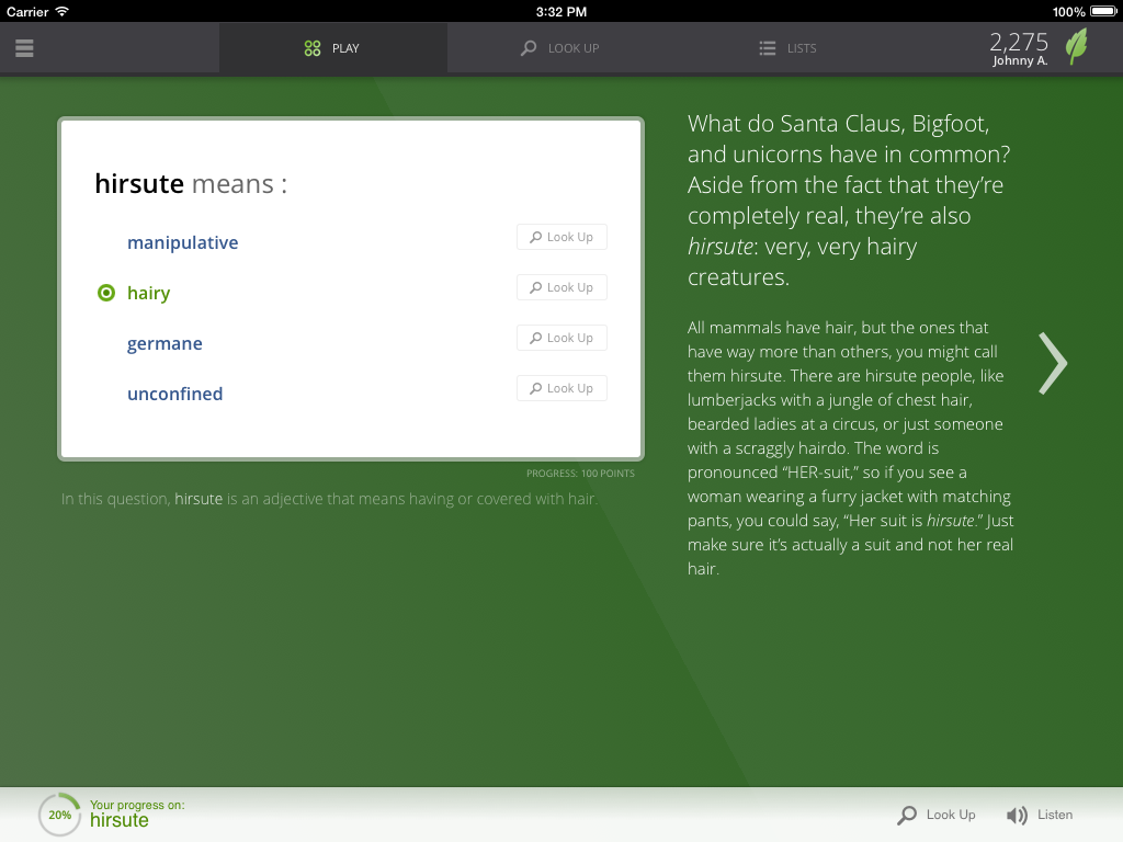 It's a game. Sure, there’s a lot of science and technology muscle behind our technique, but expanding your vocabulary doesn’t have to be a brainbuster. We’ve turned learning vocabulary into an addictive game. Accumulate points, achievements, and badges while competing against your Facebook friends, your classmates, or other members of the Vocabulary.com community. Improving your vocabulary has never been this much fun.