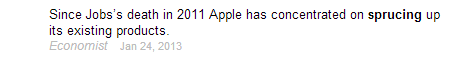 And then, as the UK-based website The Phrase Finder tells us, spruce expanded its scope yet again in the early 20th-century, as Americans began using the verb spruce to describe the spiffing-up of things beyond one's personal appearance, such as a living room or Apple's line of products. History buffs may recall Howard Hugh's World War II-era airplane prototype nicknamed the "Spruce Goose" due to its ground-breaking nature and wood-based design. This blending of spruce as "modern and up-to-date" and spruce as "tree" demonstrates that the word's adjectival form was still in ciruclation. Now, in the US at least, it feels almost as unfamiliar as the jerkins from which it derived.