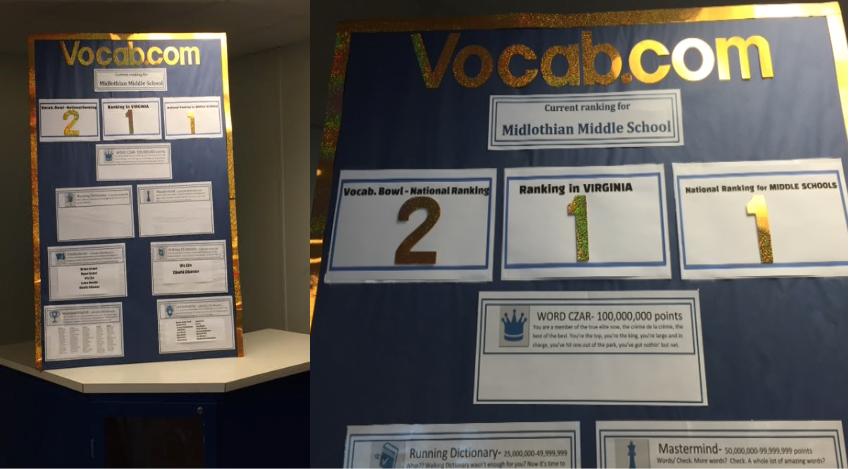 "We had so much fun during the morning announcements — at first challenging other schools within Chesterfield County Public Schools, then tackling the large Texas high schools we were competing against," Jorgensen said. "We have a display in our front lobby keeping track of our standing in Virginia, among middle schools nationwide, and in the Vocab Bowl overall. We also have displays in classrooms and hallways recognizing top point earners and students who mastered contest lists. Our whole school was energized and enthusiastic about learning new words through Vocabulary.com!"