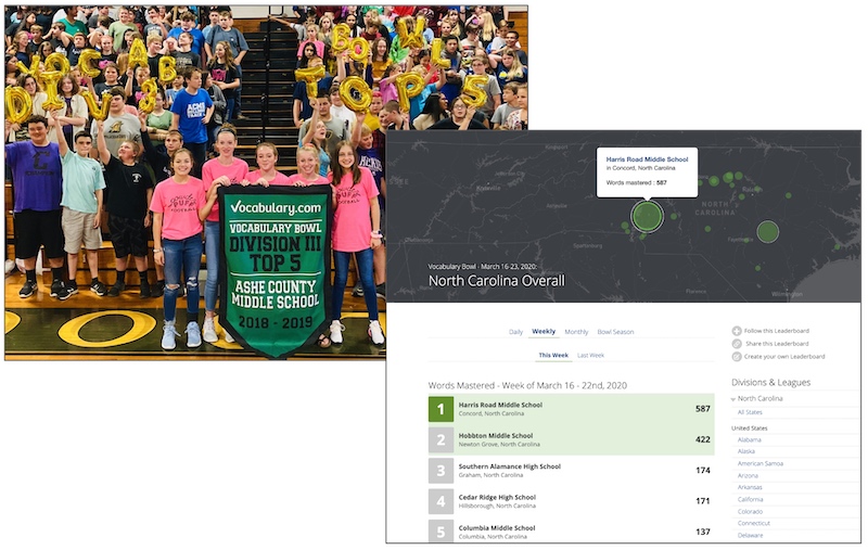 Competing in the Vocabulary Bowl is another great way for students to feel connected and work together in a remote learning environment. The Bowl is a year-round online competition where schools compete to master the most words. A lot of teachers start by setting small goals, like challenging students to propel their school to the Top 10 on their county or state leaderboards for a day. Here's how to get your school involved in the Vocabulary Bowl.