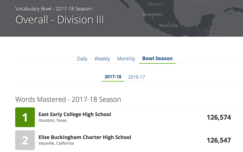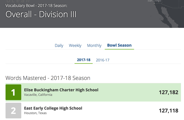 Here at Vocabulary.com, we often say that the more you play, the more you learn, so everybody wins. When a student masters a word, it's more than just a point for their school. It's measurable growth that adds up over time.That's why we root for everyone to keep mastering more words. We're thrilled that so many students at East Early College High School and Buckingham Charter High School have embraced the Vocabulary Bowl as a catalyst for this level of investment in their academic success. We will be glued to the leaderboards until the Vocabulary Bowl ends on April 30th.