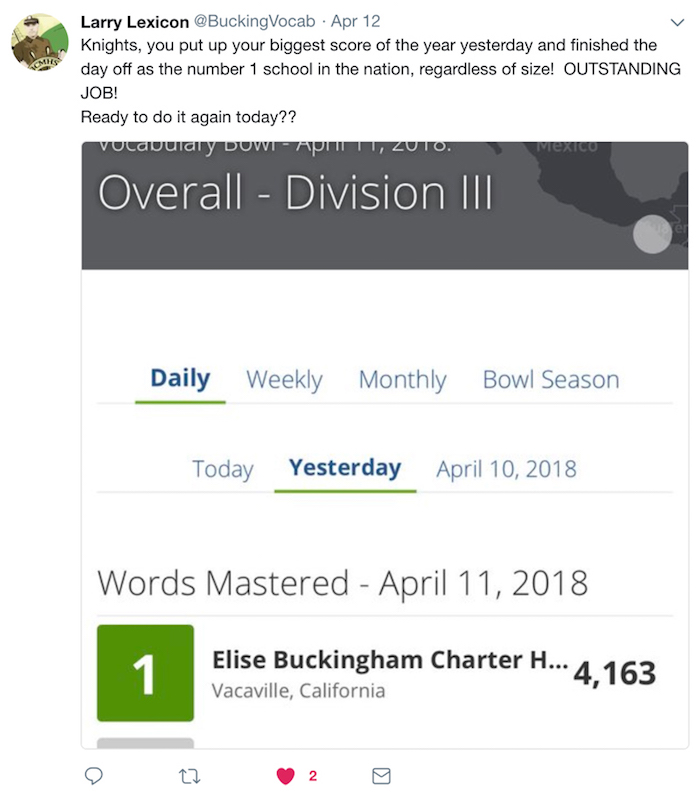 Project the leaderboards: Long before Buckingham Charter was vying for a championship banner, they just wanted to do well in October. Mr. Price often projects and Tweets results from the daily leaderboards to keep his students focused on what they can accomplish short-term. Over time, that strategy has translated into 125,000 words-mastered and counting.