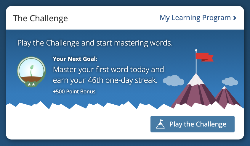 Aim for 5 sessions of Challenge play each week. We recommend playing the Challenge for 15 minutes or more, five times a week. If you want to turbo-charge your test prep, spend more time playing the Challenge. Increasing your Challenge time will increase the follow-up that you're getting on your trouble words, plus expose you to new words that we think you're ready to learn.