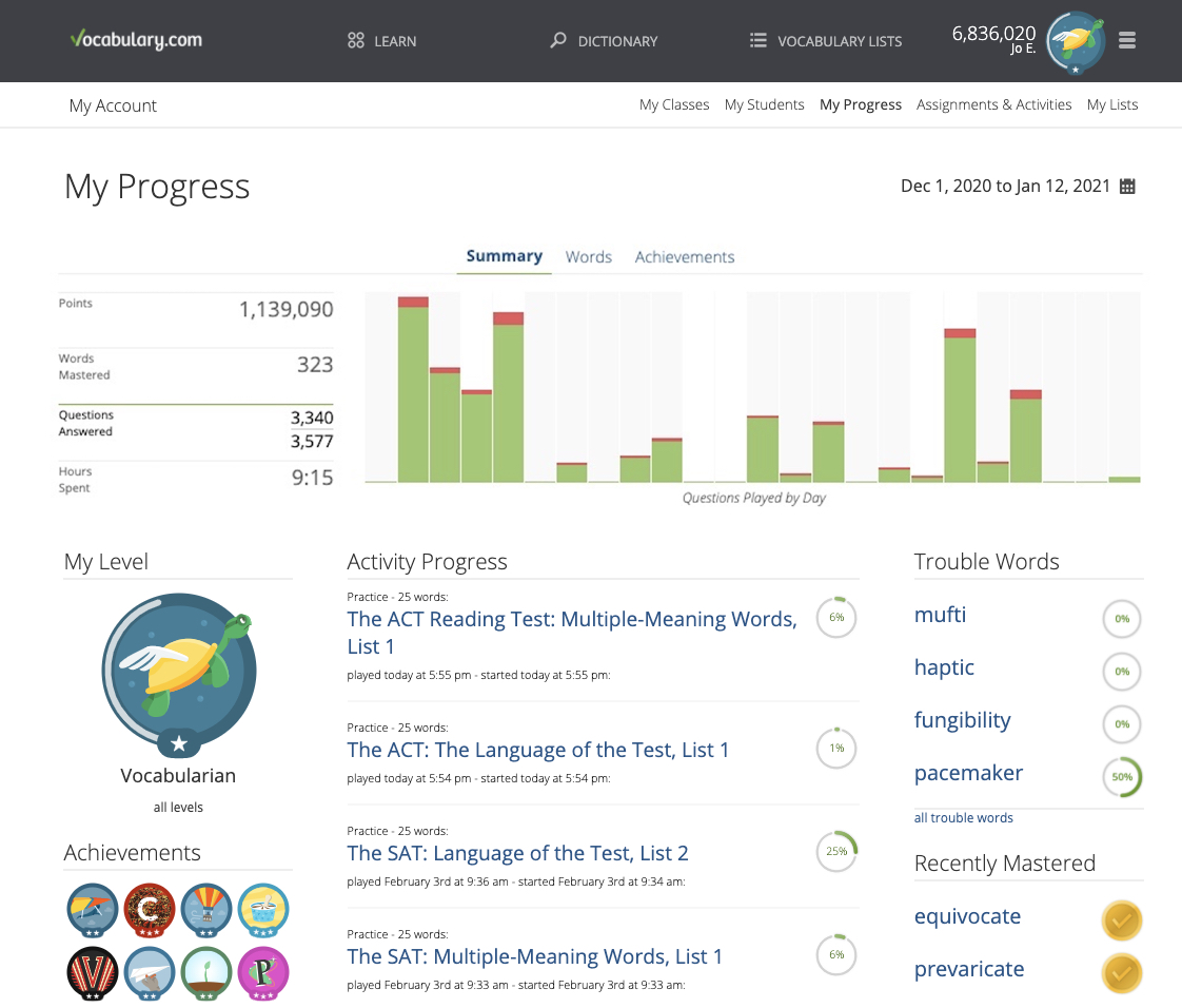 Monitor your progress. To view your recent activity and accomplishments, visit the My Progress section. The summary graph shows you how many questions you've answered, how much time you've spent, and how many words you've mastered for any time period you select. You'll see any unfinished practice activities, which words are currently giving you the most trouble, and all of the words you've mastered so far.
