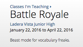 English teacher Tony Wilson of Ladera Vista Junior High in Fullerton, California initially set up his 8th grade classes using a traditional format -- creating one Vocabulary.com class for each one of his physical classes, and assigning lists related to their reading and overall vocabulary expansion (e.g., Lord of the Flies lists, Scope magazine article lists, Latin prefixes, SAT lists, etc.).Before Wilson knew it, the students took to Vocabulary.com and began to compete for the top spots on each of the class leaderboards. In fact, a few of his students felt like the competition based on single class leaderboards was too confining.