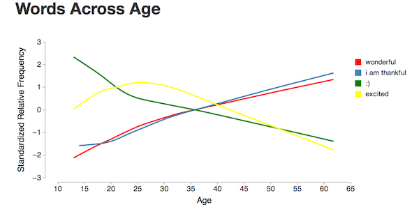 The study's site also offers a fun interactive feature where you can see how a word or set of words track by age. Here we can see how older people will use words and phrases like "I am thankful" or "wonderful," while younger users will use "excited" or just ":)" to get at the same idea.
