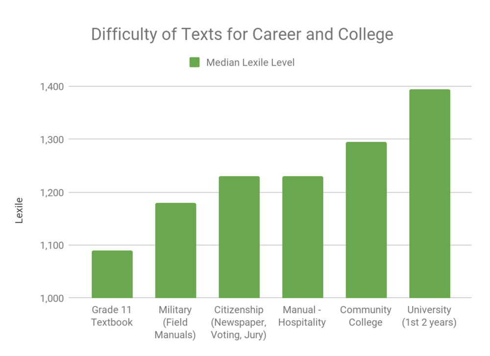 In 2008, when researchers were looking at the curriculum used throughout the United States, they found something alarming. When they analyzed the difficulty of the reading that students were required to do in high school, they found it to be substantially less complex than the reading that would be required of these students in career training or higher education. In addition, they found that recent graduates were expected to understand these complex texts without the scaffolding that is often provided in high school: no summaries, no glossaries, no teacher's explanations.
