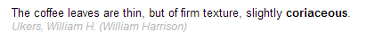 Coriaceous means "leathery" or "tough" and it's not a word you see everyday. In fact, the usage tracker on coriacesous's dictionary page on Vocabulary.com shows zero uses in news, business, or arts and culture contexts. Instead, coriaceous crops up in scientific descriptions of plants, as in: