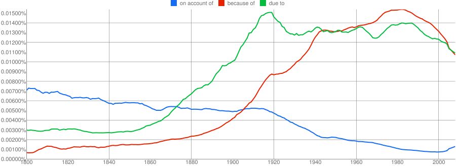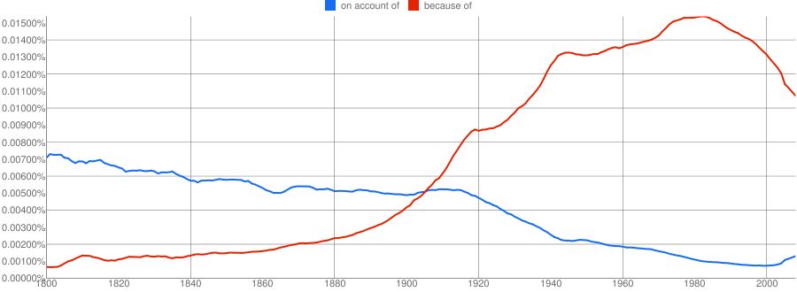 Recently I was writing a tweet and typed "on account of." Something about it seemed wrong to me, but I couldn't say what. I rewrote my tweet, determined to look into the troubling phrase when I had a moment.