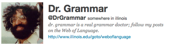 Follow @DrGrammar on Twitter; even though the picture shows me wearing the