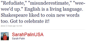 In a tweet later that same day (below), Palin decided to recast her mistake as an experiment in creativity, arguing that word coinage is common in English and suggesting that her use of refudiate was somehow Shakespearean.