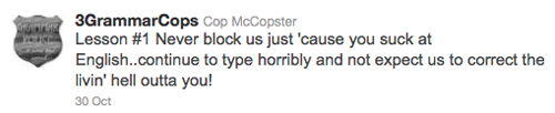 Some tweeters, like @grammarcop and @3grammarcops, conduct warrantless online searches to correct errors wherever they occur.