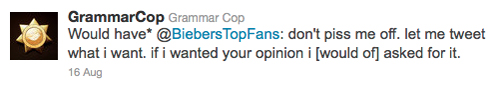 That said, not everyone on Twitter appreciates being twitted by the grammar cops, illustrating Baron's Second Law of English usage: