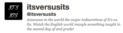 Although its name doesn't say so, the tautological @itsversusits concerns itself not with a contentious divorce between the Itses (the name was shortened at Ellis Island),but with maintaining the distinction between possessive its and the contraction, it's.