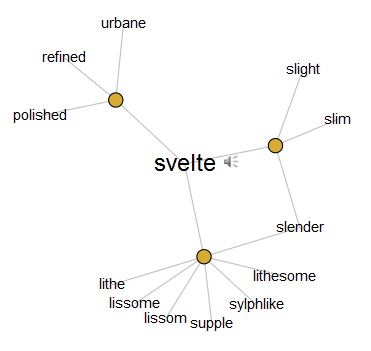 For this is a word thick with connotation. Look at its map on the Visual Thesaurus: svelte connects to three nodes, one of which branches to slight, slim, slender, another to lithe, lissome, lissom, supple, sylphlike (I have to catch my breath after the frisson that runs down me saying that word), lithesome, and again slender, and the third to polished, refined, and urbane. The svelte person may be lean but is not meagre; this is a person of substance as Cognac is a beverage of substance. To be svelte is to have the air of an eau-de-vie of humanity: a special one plucked out from among the many. I was in my youth slender by nature but could barely manage svelte at even the best of times.