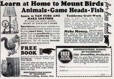 Ah, yes. In the back pages of Popular Science magazine, I had seen an ad for the Northwestern School of Taxidermy, in Omaha, Nebraska. A series of booklets mailed to me would engage me in the "pleasure and profit" of taxidermy. Pleasure? I don't know about that, as I preferred my creatures flitting and flying, scampering and scurrying. Skinning and stuffing them for pleasure? I don't think so. Profit? My Saturday afternoon job delivering groceries by bicycle gave me all the spending money I needed. In fact, looking back I wonder what did I want out of taxidermy. As I think about it today, what I was about to do, at the age of 14, was nonsensical.