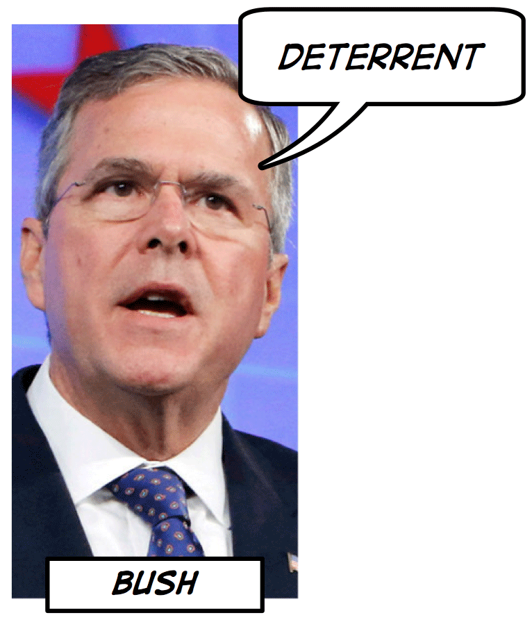 Jeb Bush used deterrent twice during the foreign policy portion of the debate. Several candidates mentioned the idea of going on the offensive to avoid conflict, using a display of might as a deterrent to further hostilities. Here, Bush mentions beefing up cybersecurity, and at another point, Ted Cruz invoked the principle of “Peace Through Strength,” a phrase which has ancient roots but is most often associated these days with Ronald Reagan.