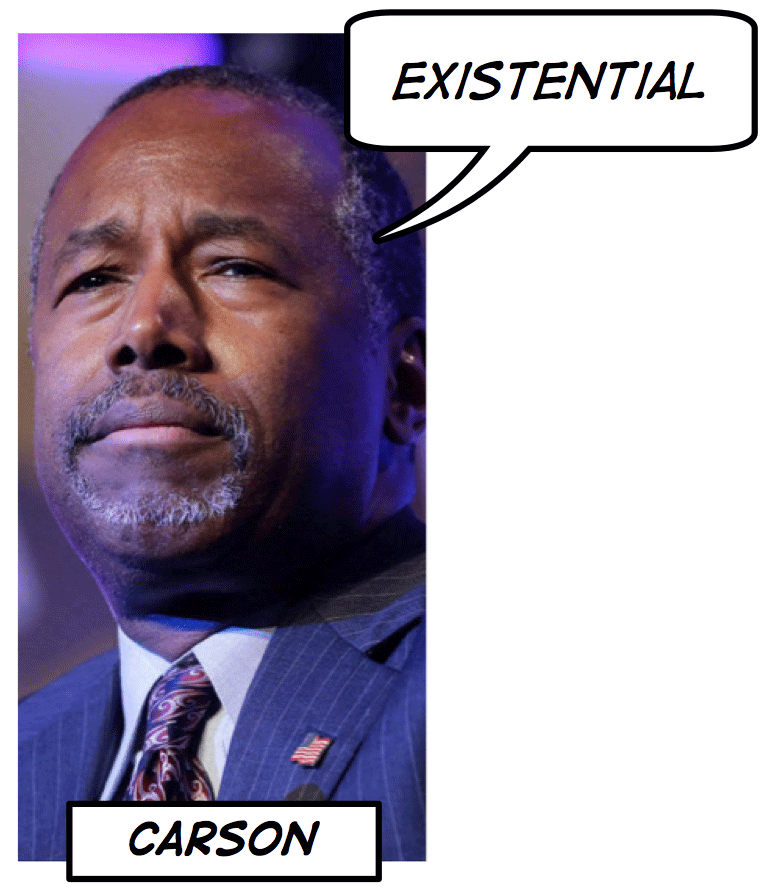 Ben Carson used existential in an interesting way during the debate. The word is often associated with philosophical pursuits, such as questions of being, or of acting in the world, but that’s not how Carson uses it here. He is being much more direct when he says that ISIS is a threat to the very existence, the very lives, of Americans.