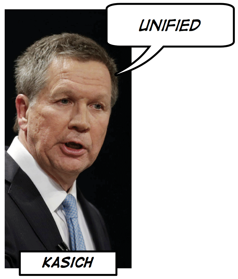 John Kasich used unify to describe how his approach to foreign policy would be to bring together America’s allies in a united front. But he also applied it to the home front, as an implicit criticism of his fellow Republicans for infighting rather than following the Reaganesque policy of staying positive and keeping the party united together.
