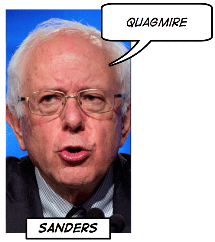 A quagmire is a mess that is very hard to get out of. Sanders used the word when discussing the prospect of sending troops into Syria, warning that such intervention could turn into a quagmire. Quagmire became a big political word a with the publication of David Halberstam's book on the war in Vietnam, The Making of a Quagmire. Sanders may have been alluding to Winston Churchill's oft-quoted line, "Russia is a riddle wrapped in a mystery inside an enigma."