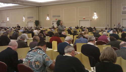 Dan's dominance should come as no surprise to those who follow the speed-solving scene, as the myth of his Wilt Chamberlain-esque numbers of crosswords he's solved these past few years grows and grows. And when I say "grows," I mean both the legend and his reported figures. Some estimates have him solving nearly 35 a day. I should know, as he routinely posts on his blog his blinding times on all of my puzzles. (Actually, Dan says he's only been solving 25 a day. He's eased off his torrid pace, saying, "I was more unemployed then.") Dan was in first place at the end of Saturday's action last year, but he ended up coming up short on Sunday's Puzzle 7 and just missed the finals. "Glad I have a bigger cushion this year," Dan says.