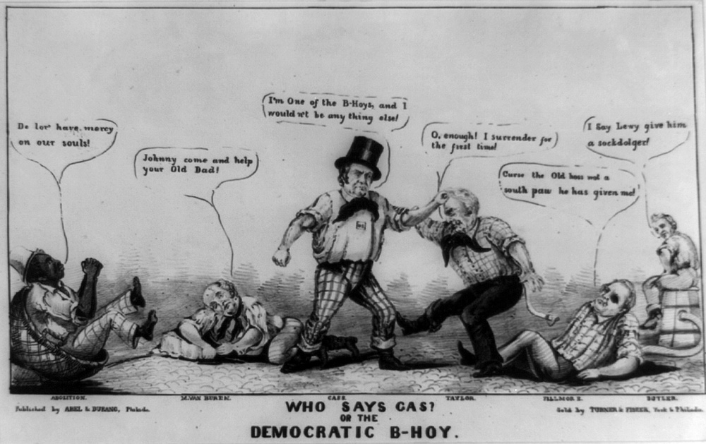 Boxers and other rough-and-tumble types picked up the "southpaw" terminology over the course of the 19th century, well before baseball became the national pastime. An 1848 political cartoon demonstrates how the term got used pugilistically, with Democratic presidential candidate Lewis Cass slugging his Whig opponents, Zachary Taylor and Millard Fillmore, with the latter shouting out, "Curse the Old hoss, wot a south paw he has given me!"
