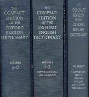 Lexicographical cognoscenti will immediately identify the three-volume work as The Compact Edition of the Oxford English Dictionary. The Compact Edition is a micrographic reproduction of the OED, with each page making room for four reduced pages of the original. A magnifying glass is handily supplied to avoid damaging the reader's eyesight. The only problem is, there was no Compact Edition in 1963. It was first published as a two-volume edition in 1971, but what we see in Pryce's office is even more anachronistic: it's the edition published in 1987 with Robert Burchfield's supplement to the OED in a third, slimmer volume. (Even after the 1987 edition was published, book clubs continued to sell the original two-volume version for bargain prices. Like many Americans, I was first exposed to the OED through one of these book club editions, squinting through the magnifying glass at the tiny type.)