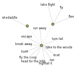 For example, if you click on the first meaning of "run away" in its Visual Thesaurus word map's meaning list, your students can see the different synonym options and weigh which one best fits the context of the description.