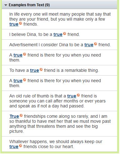 Take this sample of student writing — an essay from BookRags on friendship — as an example. When I pasted this text into VocabGrabber and sorted the grabbed word list by "Occurences" to assess which words appeared most often in the text, I discovered that the word true was used nine times in this four-paragraph essay.