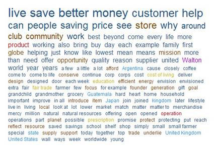 Wal-Mart's "values" page is in a similar vein. Whether intentionally or not, it succeeds in making its expanded statement a kind of holographic enlargement of its advertising slogan: "Save Money. Live Better." Even the most scattered attention span, clocking every tenth word or so on the page, would probably still walk away with the right take-home message: