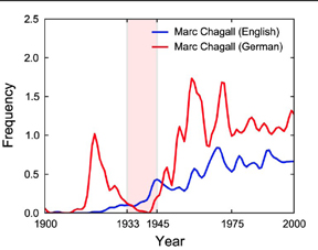 For example, the graph below tracks the frequency of the name Marc Chagall (1887-1985) in English and German books from 1900 to 2000, revealing a sharp dip in German mentions of the modernist Jewish artist from 1933 to 1945. You don't need a graph to correlate Hitler's ban on Chagall and his work with the artist's disappearance from German print (other Jewish artists weren't just censored by the Nazis, they were murdered), but it is interesting to note that both before and after the Hitler era, Chagall garners significantly more mentions in German books than he does in English ones.