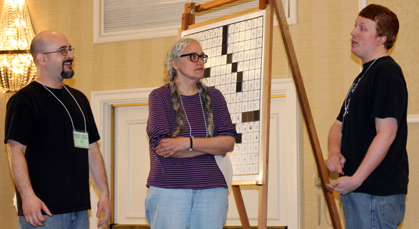 But the smiling stopped at the Finals board. The three contestants were set: it was a repeat of last year's finals, only this time Tyler was the first seed and had earned a head-start of 12 seconds over Dan and 14 seconds over Anne. The Final was made by Merl Reagle, a star of the documentary Wordplay. Merl is normally known for outrageously funny themed puzzles, so it felt a little off that he was assigned the themeless final. No matter, he was allowed to show off his stuff. A small sample of the clues will suffice: "Like ABC or KLM" clued IN CAPS, "Exercise program using a vertical bar" gave you POLE DANCE, and my personal favorite, "Matching outfit" for EHARMONY.