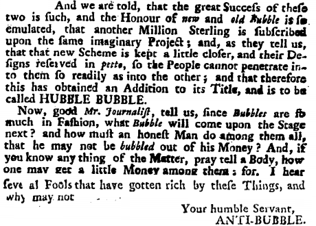 The earliest use of the "bubble" metaphor that I found in the archive appears in the Dec. 12, 1719 issue of The Weekly Journal or Saturday's Post, a newspaper published by Nathaniel Mist, a vocal opponent of the ruling Whig administration. A correspondent known as "Anti Bubble" writes to Mr. Mist about "new bubble," "old bubble," and "hubble bubble," before asking: "Now, good Mr. Journalist, tell us, since Bubbles are so much in Fashion, what Bubble will come upon the Stage next? and how must an honest Man do among them all, that he may not be bubbled out of his Money?"